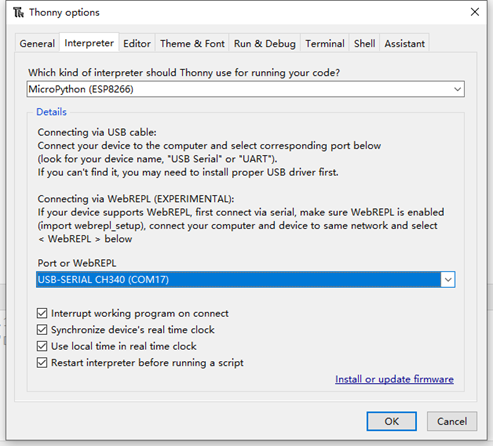 At this time, the ESP8266 module has not yet uploaded the MicroPython firmware. Click "Install or update firmware" in the lower right corner of the above picture to update the firmware using the built-in tool.