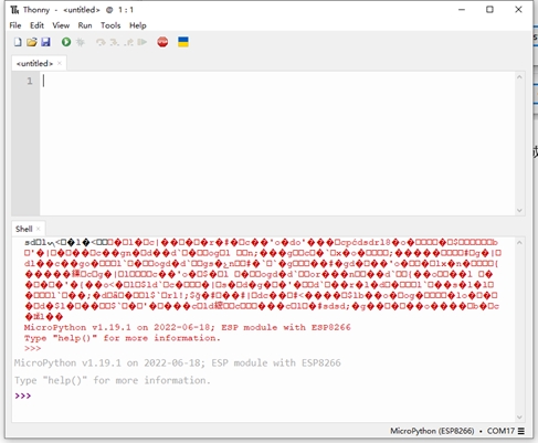 The software preparation work is over, and the following display will appear after closing the download interface. The red text is garbled because ESP8266 will print a string of codes with a baud rate other than 115200 when it starts up. This code cannot be recognized by MicroPython Shell. When Python’s iconic symbol >>> appears, it means that the firmware is uploaded successfully.