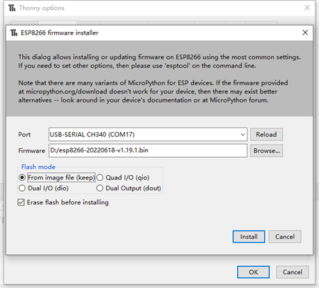 Select the port (COMx) where the ESP8266 module is located, and select the location where the downloaded MicroPython firmware (.bin file) is located. Check the flash mode: from image file (keep) (the speed will be slower, but it only needs to be burned once and it is not easy to make mistakes), and check the option Erase flash before installing. Press the Install button.