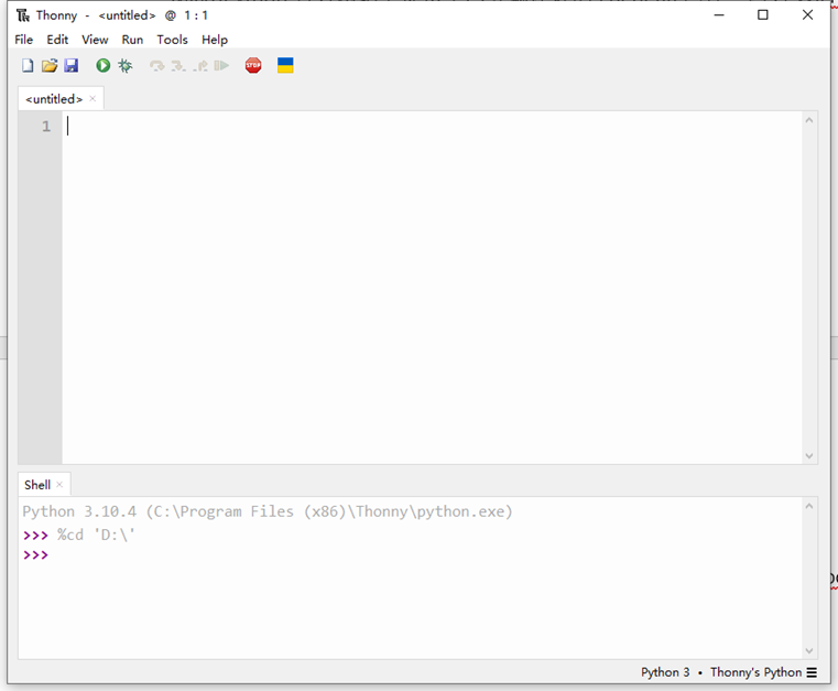 Open the Thonny, the main interface is as shown below. Thonny uses the Python interpreter in the installation directory by default.