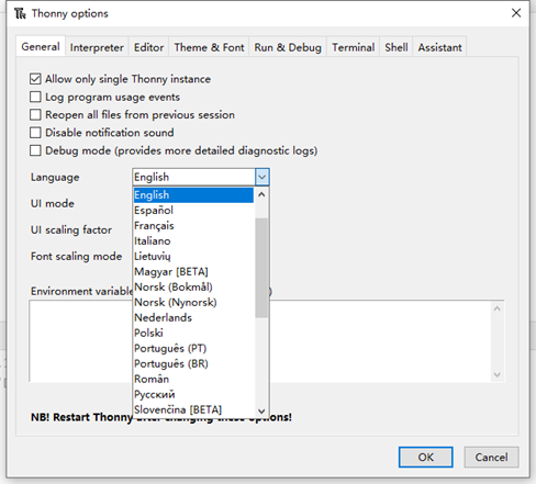 Open Tools -> Options to enter the options page. In the first tab General, we can choose the language we need (needs to be restarted).