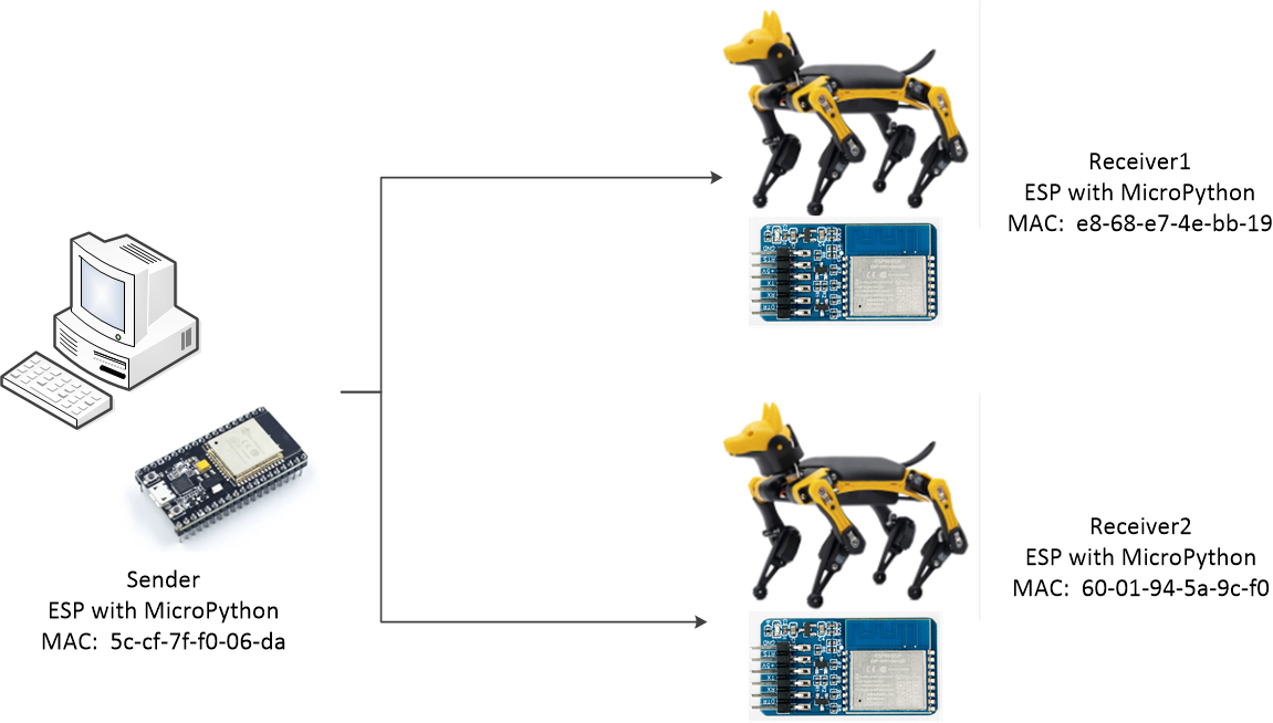 Petoi group control can use the ESP-NOW communication function of the ESP8266.