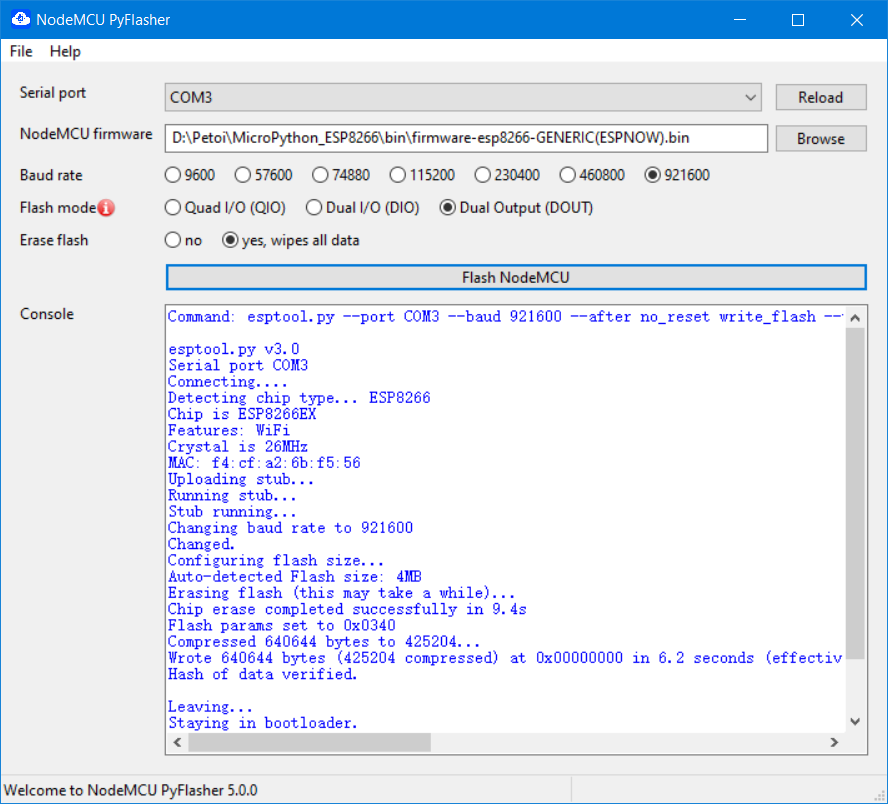 If after burning the ESP-NOW firmware, the symbolic >>> symbol of Python does not appear in the shell interface, it means that the firmware burning failed. You can try to use the Flash burning tool NodeMCU-PyFlasher.exe, and the burning configuration is shown in the figure below :