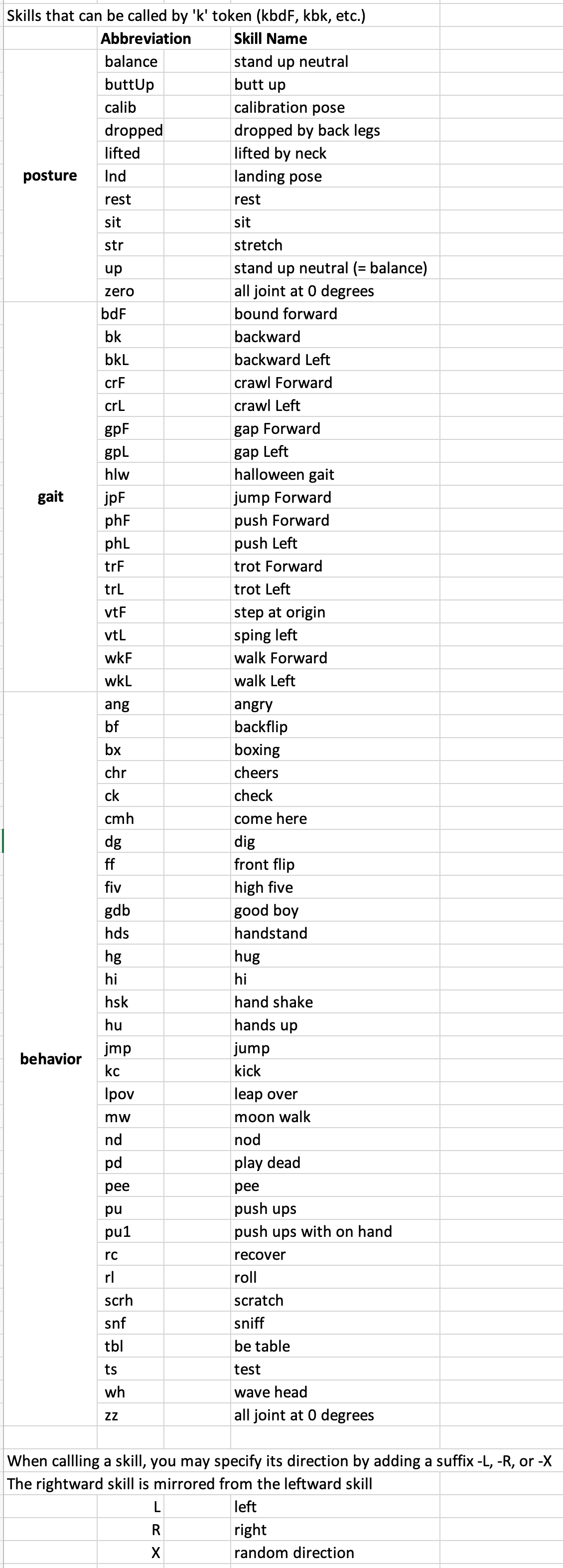 All the skill names in the list can be called by adding a 'k' to the front and deleting the suffix. For example, there's "sitI" in the list. You can send "ksit" to call the sitting posture. If a skill has "F" or "L" as the second last character, it's a gait. It means walking forward or left. Walking right is a mirror of walking left. So you can send "kwkF", "kwkL", "kwkR" to make the robot walk. Similarly, there are other gaits like trot ("tr"), crawl ("cr"), and stepping ("vt").