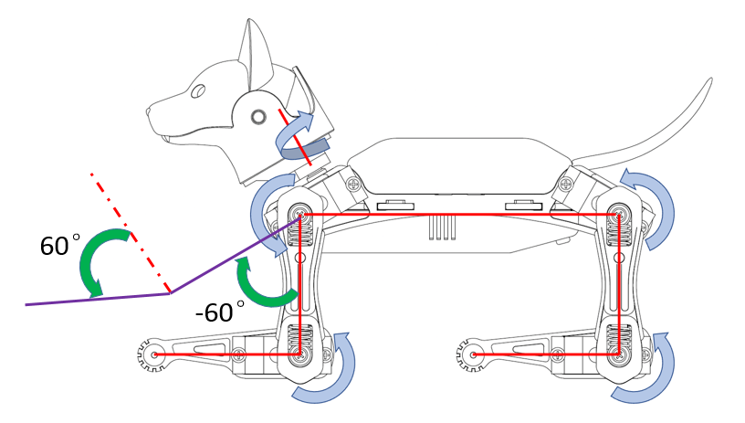 The 13th element in the array (-60, corresponding to No.8 servo) indicates that Bittle's left front thigh rotates 60 degrees clockwise around the joint center point.