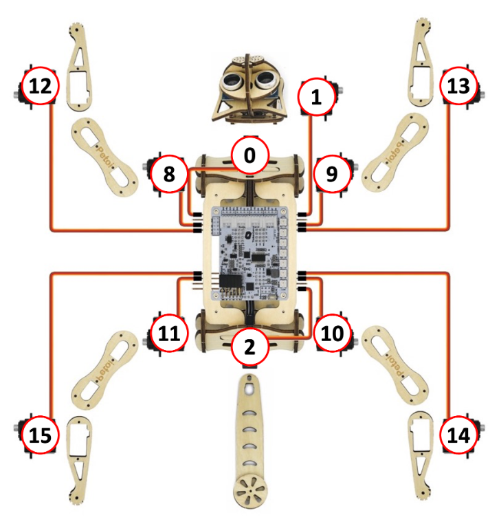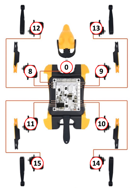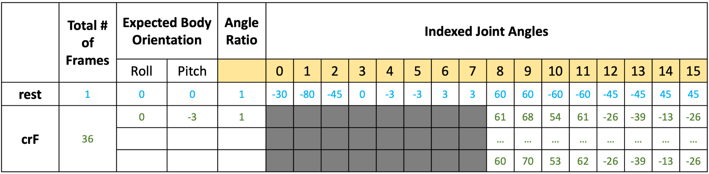 Each action frame in the crF (crawling forward) contains 8 joint servo angle values, and the corresponding servo index numbers are arranged from small to large, starting from 8.