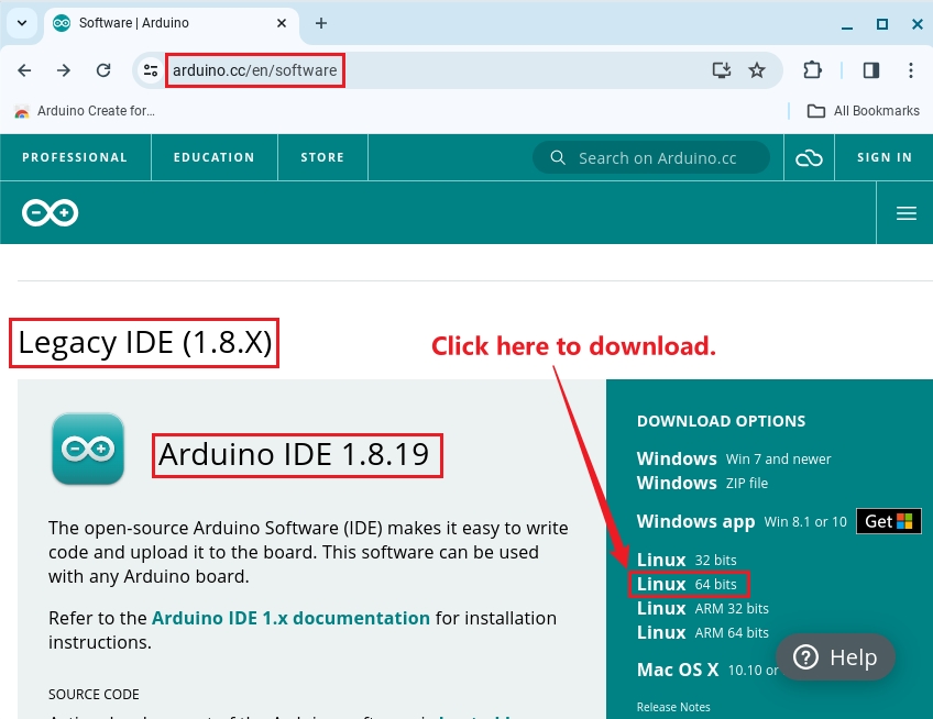 Open the website (www.arduino.cc/en/software) and download the corresponding type of Legacy Arduino IDE: