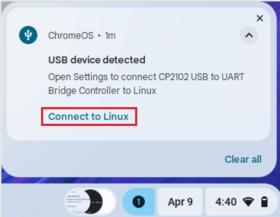 After using the USB data cable to connect the BiBoard and Chromebook, you will see a prompt: Please click Connect to Linux.