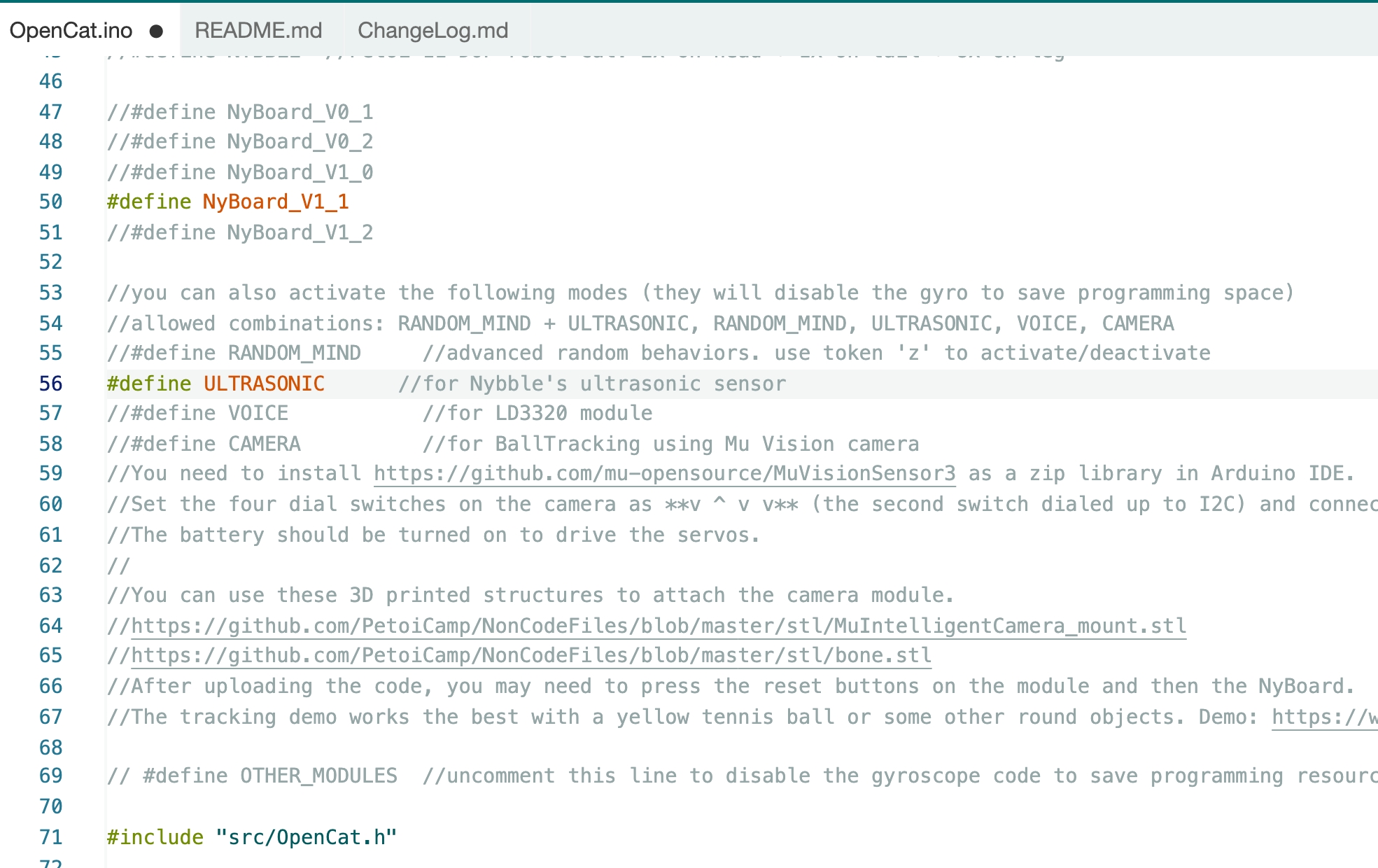 Sometimes, you may want to modify the robot's "joint-pin" mapping. You can change it in OpenCat/src/OpenCat.h. Adjust the code block to match the board version at the beginning of OpenCat.ino. After the modification, remember to save the changes and redo the uploading process from step 2.