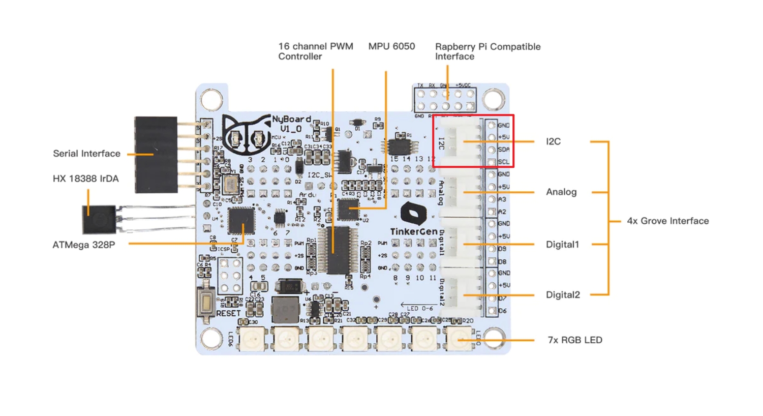 The I2C switch changes the master of I2C devices (gyro/accelerometer, servo driver, external EEPROM). On default “Arduino”, NyBoard uses the onboard ATmega328P as the master chip; On “RPi”, NyBoard uses external chips connected through the I2C ports (SDA, SCL) as the master chip.
