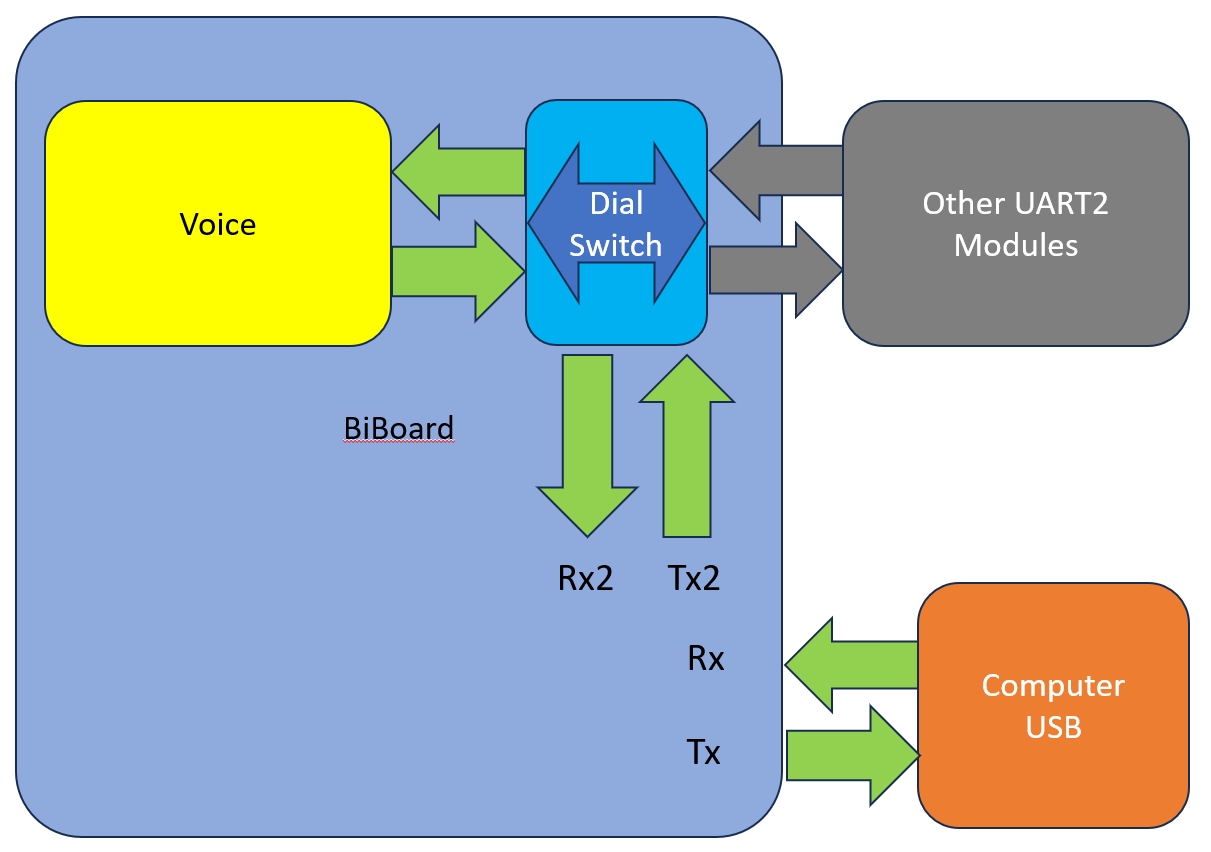UART2 shares the GPIO ports with the voice command module. When the switch is dialed to VOICE COMMAND, the Serial2 port can NOT be used. You can dial the slide switch to UART2 to free it for regular serial communication or GPIO.