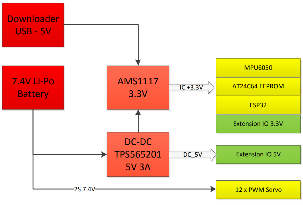 When using USB power, there’s no power output for DC-DC 5V extension and servo. So USB power mainly supplies ICs.