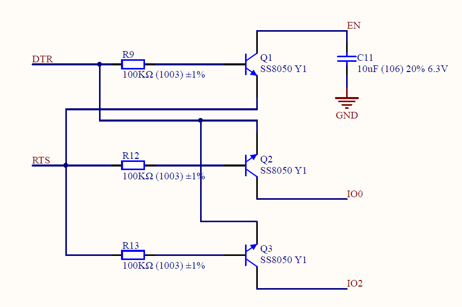 The transistors receive standard serial modem signals DTR and RTS and trigger a unique timing-sequence forcing ESP32 into download mode and then reboot. The detail of the automatic download circuit is shown below.