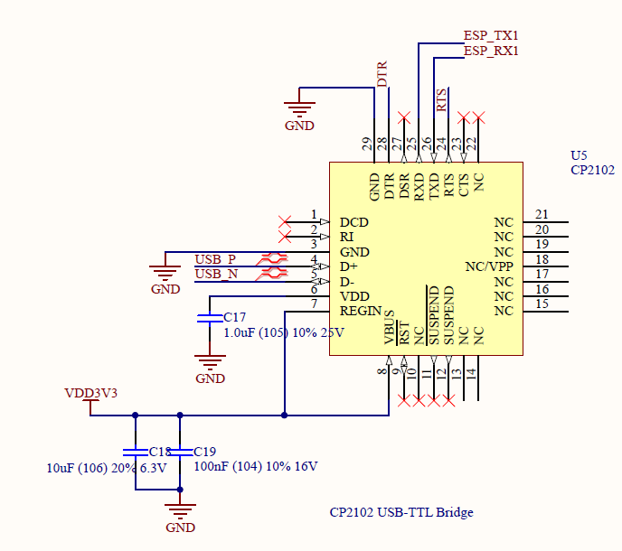 There’s no USB circuit in the ESP32, so we use the CP2102 USB bridge as officially recommended. The maximum download baud is 921600. The bridge is connected to serial 1 of the ESP32.