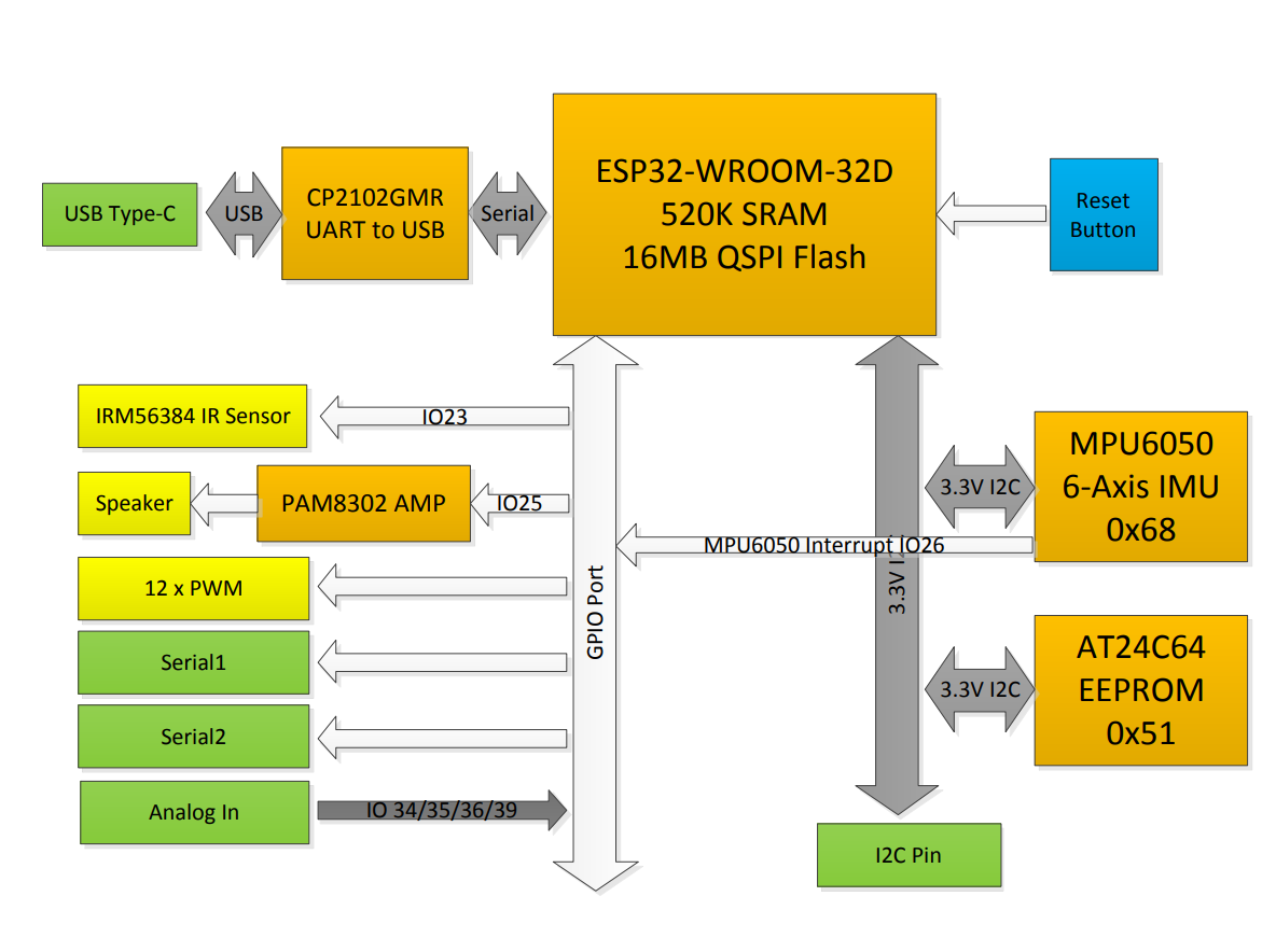 We use Invensense MPU6050, the most widely used IMU. Its I2C address is 0x68, and DMP’s interrupt is connected to IO26 of the ESP32.