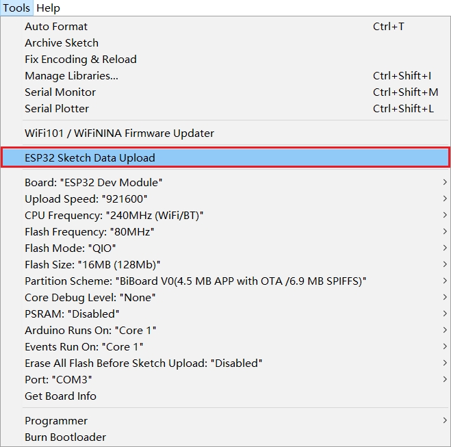 To check whether the plug-in has been successfully installed, open the Arduino IDE. Select your ESP32 development board (ESP32 Dev Module), go to "Tools", and then check if there is an "ESP32 Sketch Data Upload" option.