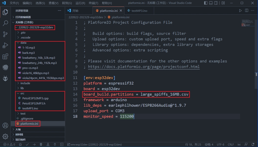 Before uploading the sketch and .mp3 files, please move the "data" folder to the project root directory, store the code files in the "src" directory, and configure the partition option "board_build.partitions" in the platformio.ini in the project root directory, as shown in the following figure: