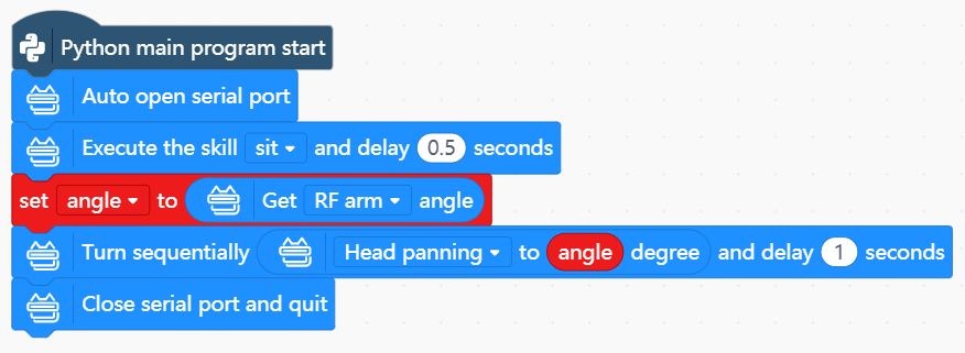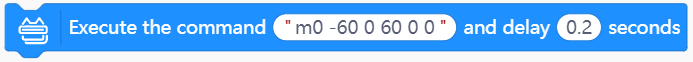 Use this block to send a serial command to the robot, which can provide you with more and more flexible control methods. For example, you can input "kkcL" (kick the left front leg), and "khiR" (raise the right front leg to say hello). For more serial port commands, please refer to the serial protocol.