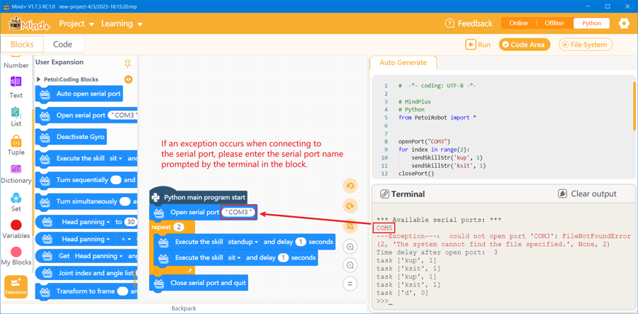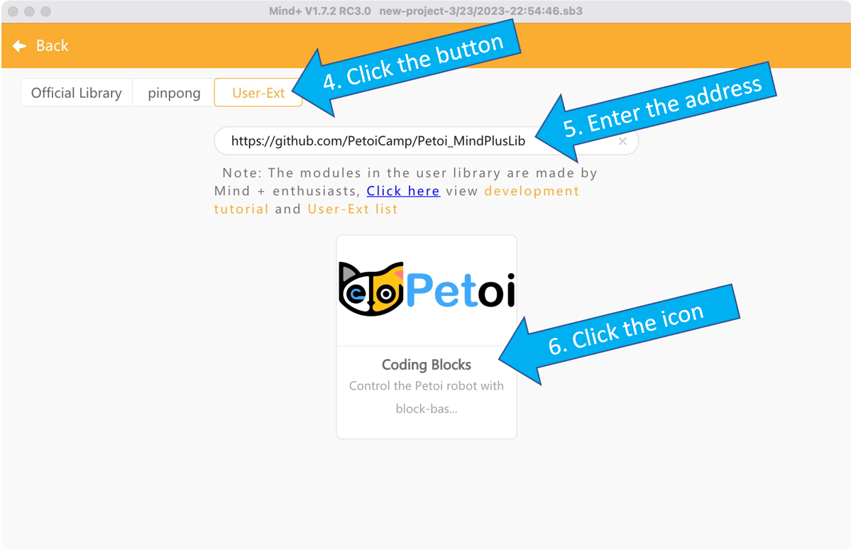 Petoi Coding Blocks is a user-extended library of Mind+.