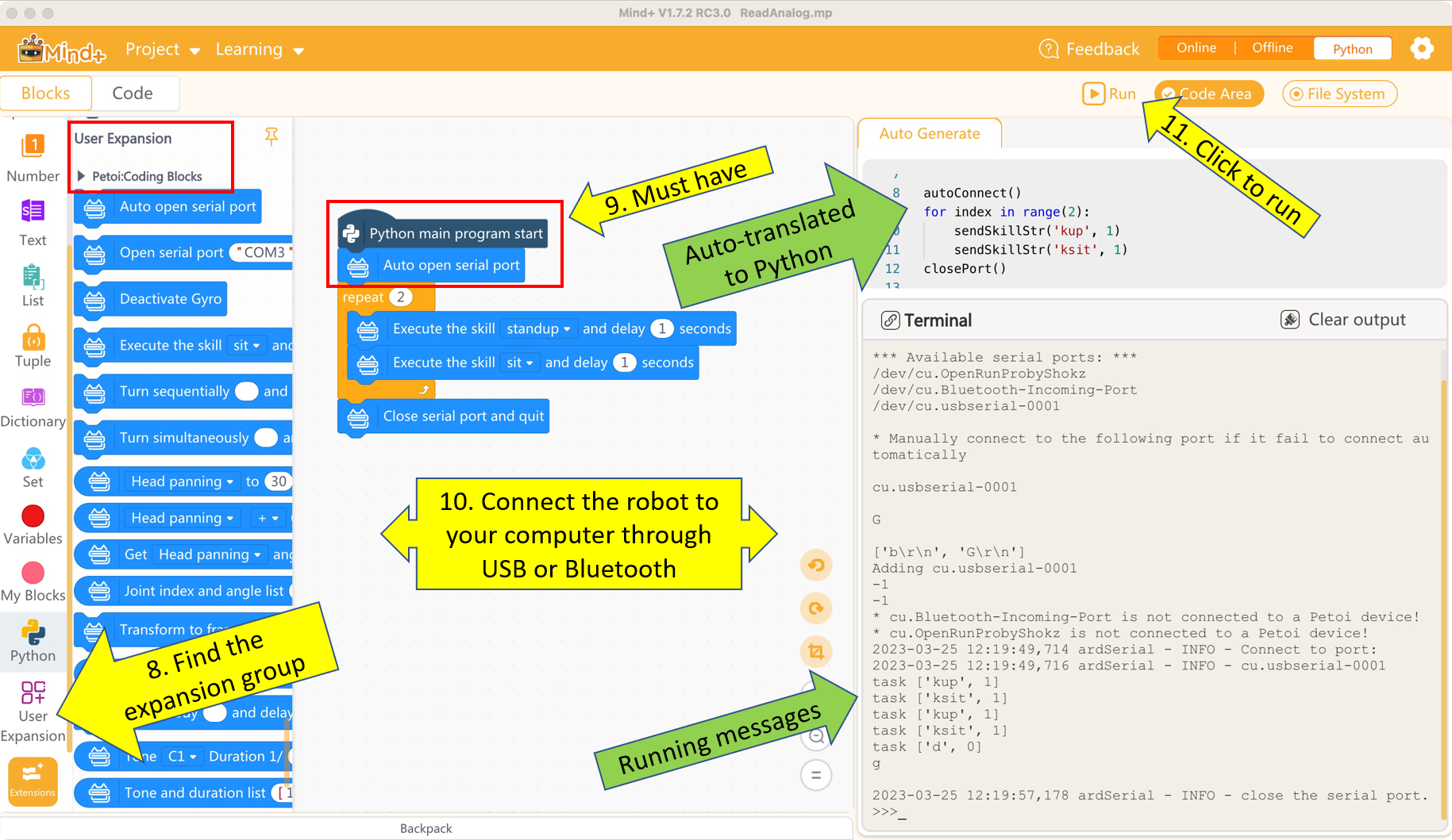This extension library can control the robot without compiling and uploading the code to the robot's main board. Click the "Run" button directly to run the program on the Python level and send instructions to the robot's serial port. If you need to stop the program while running, you can click the "Stop" button anytime. The process of the program can be divided into three steps: