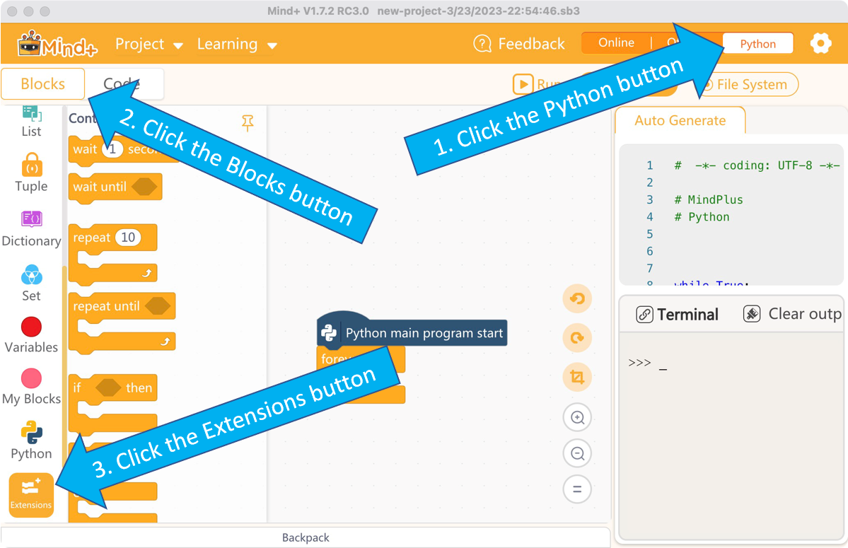 If you open Mind+ by double-clicking the code file(suffix mp or sb3) that uses this extension library or load these code files after opening Mind+, Mind+ will automatically load this extension library.