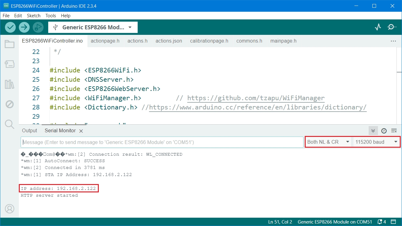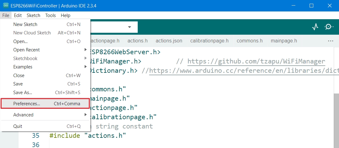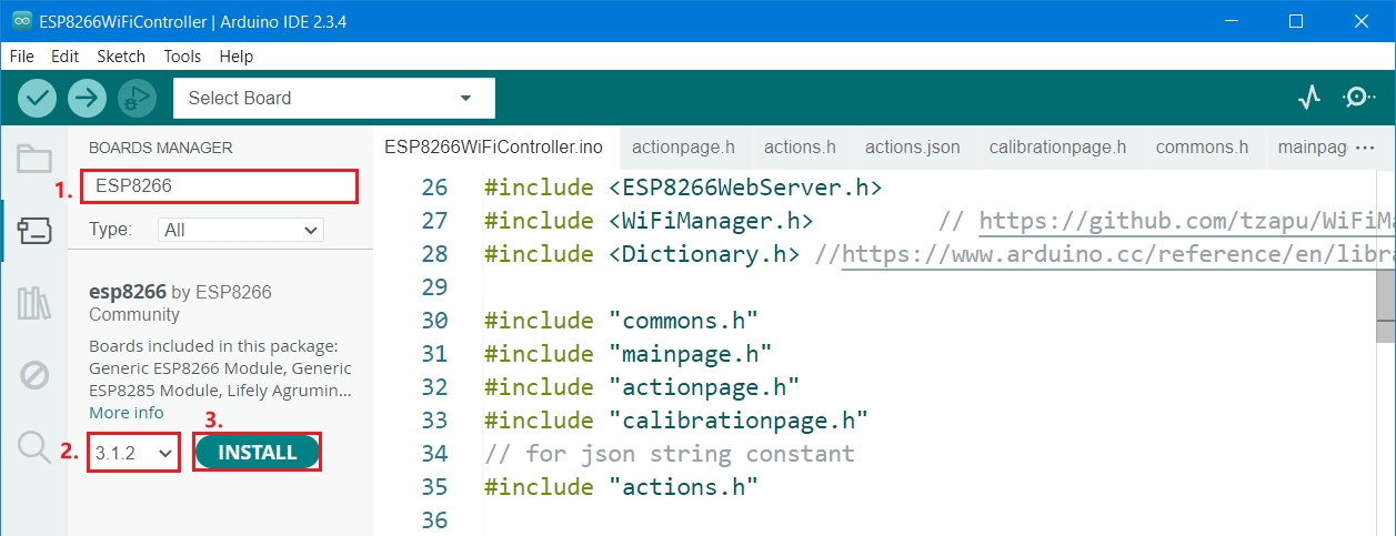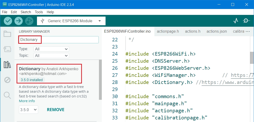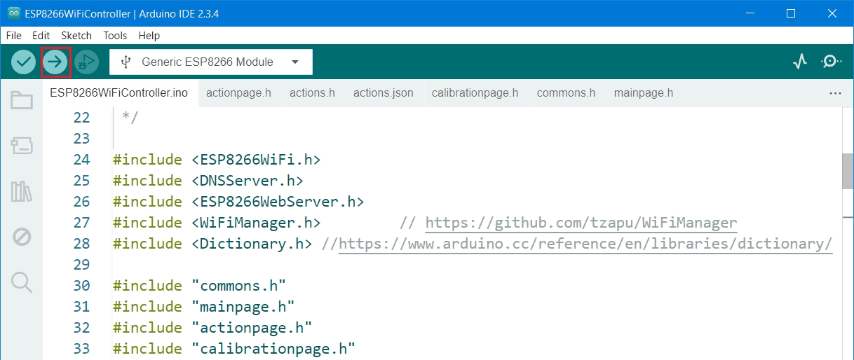 Please open the ESP8266WiFiController.ino in the Arduino IDE and install the library WiFiManager and Dictionary in the Library Manager:
