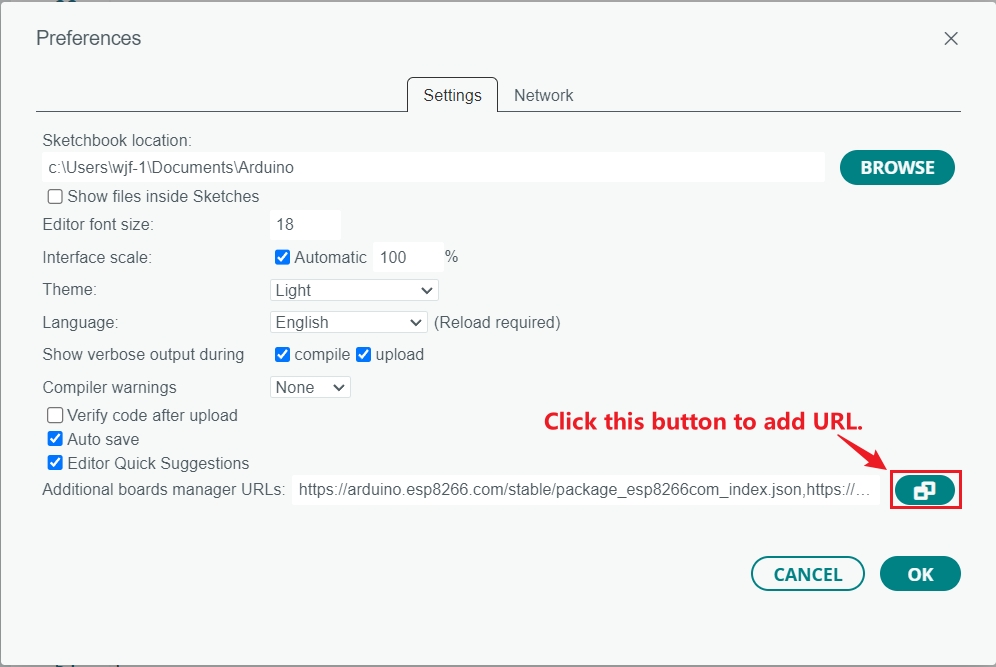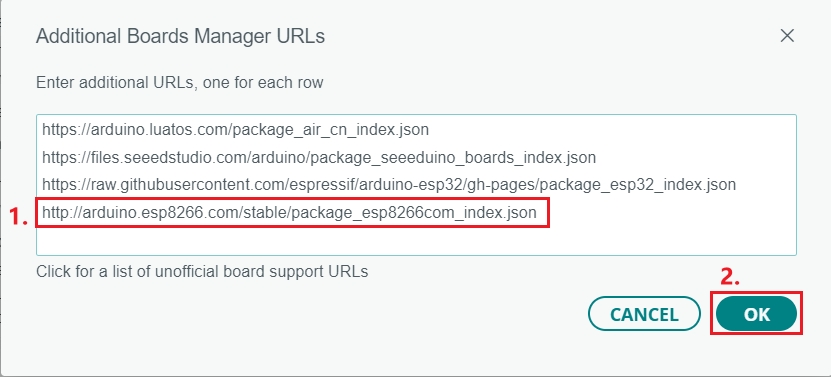 URL:http://arduino.esp8266.com/stable/package_esp8266com_index.json. Paste it into the Additional Boards Manager URLs in the Arduino IDE preferences.
