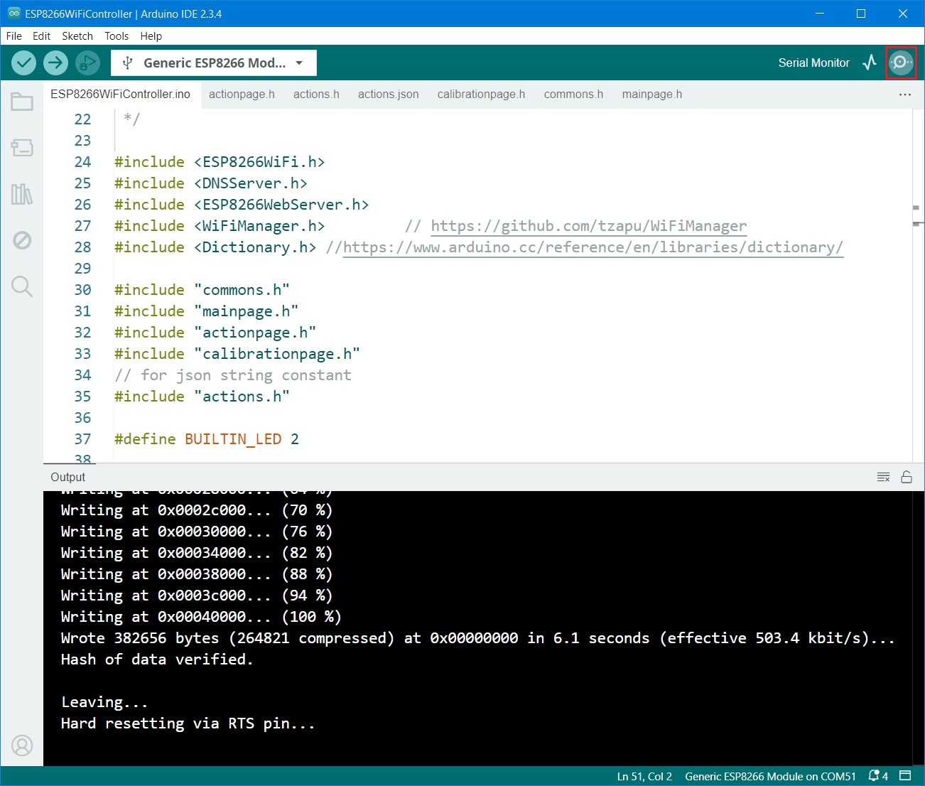 After the sketch is uploaded to the WiFi module, we strongly recommend running it with your USB uploader (USB Adapter) so you can get the serial output in the serial monitor of Arduino IDE.