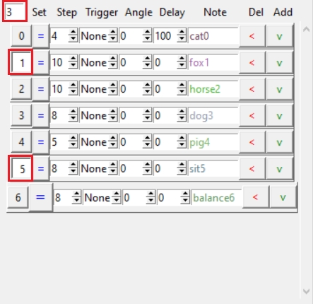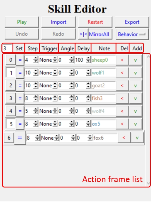 If you need some consecutive action frames in the action frame list to run multiple times in a loop, you can first enter the number of loops in the Repeat text box above the action frame list (on the left side of the label "Set"), and then use the left mouse button to select them in turn, The index numbers (the 1st item of a frame) of the first and last two frames of the continuous action frame that want to achieve cyclic motion (the index number button will appear in a recessed state after selection), as shown in the following figure: