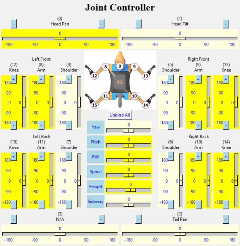 You can control multiple joints by clicking the dial "+" or "-" on each slider. All sliders with their "+" pressed will change by the same increments. Sliders with their "-" button pressed will change by the negative increments. The button can be toggled on and off. Click the "Unbind All" button to disengage all the joints at once.