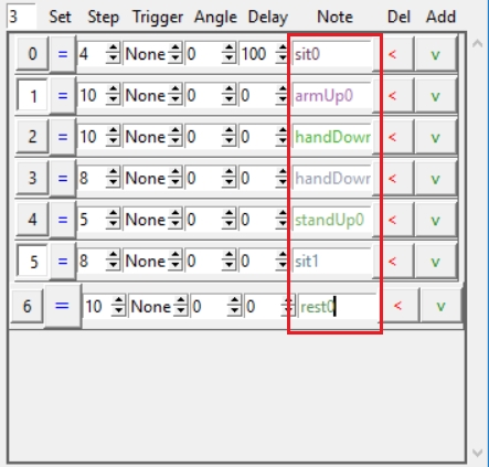 In the action frame list, the "Delay" option (the 6th item of a frame) in each action frame indicates how long the robot delays before doing the next frame of action after the action of this frame is completed.
