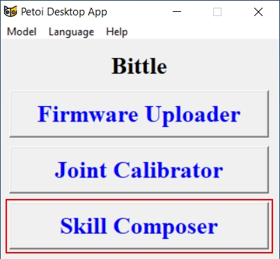 Open the Petoi Desktop App (for Windows: UI.exe / for Mac: Petoi Desktop App), click the "Skill Composer" button, and open the skill composer interface.