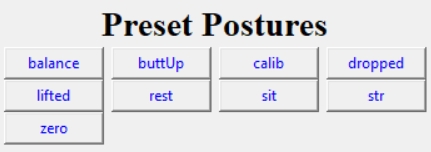 A few preset static postures move the robot's joints to specific positions. You can use them as a starting point to build your motion sequence. We usually start with the "balance" posture, with the robot standing on all four legs.