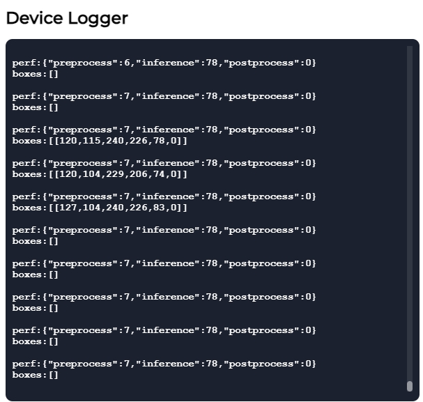 In the ‘Device Logger’ section, the device sends real-time inspection data to the computer, and the data in the ‘Boxes’ section is: