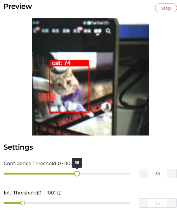 In the preview section, you can observe the output results of the Grove Vision V2 's inference in real time, for example, it successfully detects cats after downloading the pet detection function.