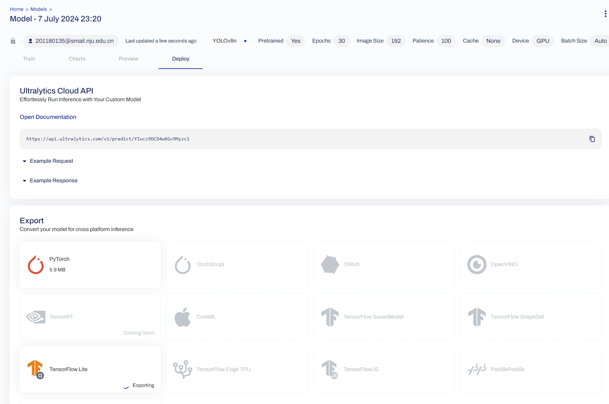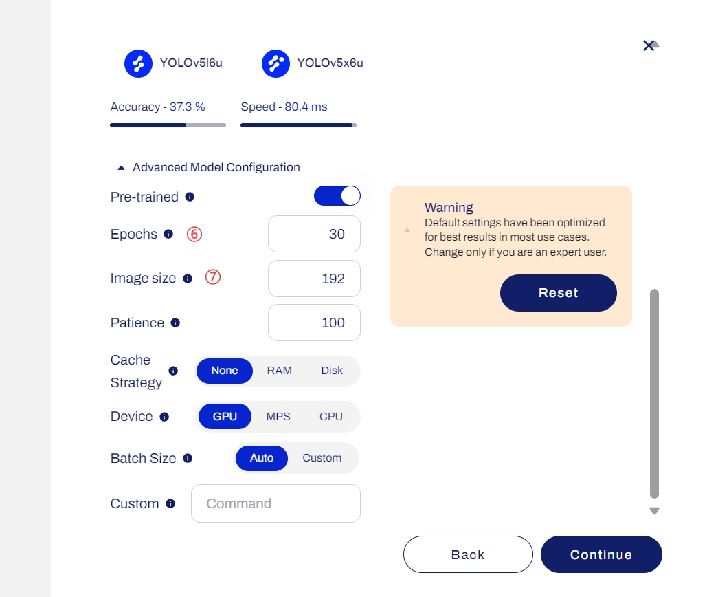 Set the Advanced Model Configuration. If you are using Google Colab for model training in the future, it is recommended to change the Epochs to 30 because although Google Colab is free, there is a time limit for using it, and 30 training is about 2 hours, which is just within the time limit. If we want to deploy the model on the Grove Vision V2 module, we also need to change the image size to 192, which is more in line with our actual application scenario. In addition, a Google mailbox is required to use Google Colab.
