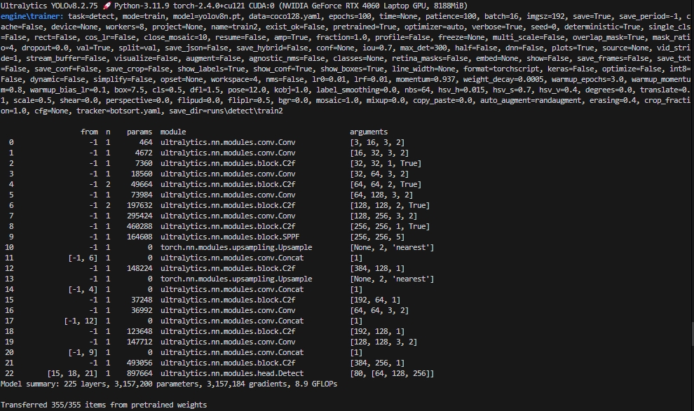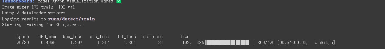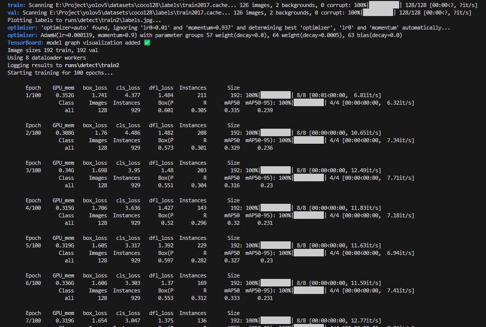Where model is the path to the model you need to train, the current Grove Vision V2 only supports the deployment of yolov8n.pt, so please choose yolov8n.pt. data is the path to the training set needed for model training, here we use a very small dataset as a test, later in this section we will explain how to create the training set for training. In addition, we have implemented custom partial label training for the coco dataset, which allows you to select specific labels for training according to your preferences and uses, enabling more flexible inference. imgsz is the image size accepted as input to the model, which must be 192. epochs is the number of times the model has been trained. In general, the more times it has been trained, the better the model fits the data.