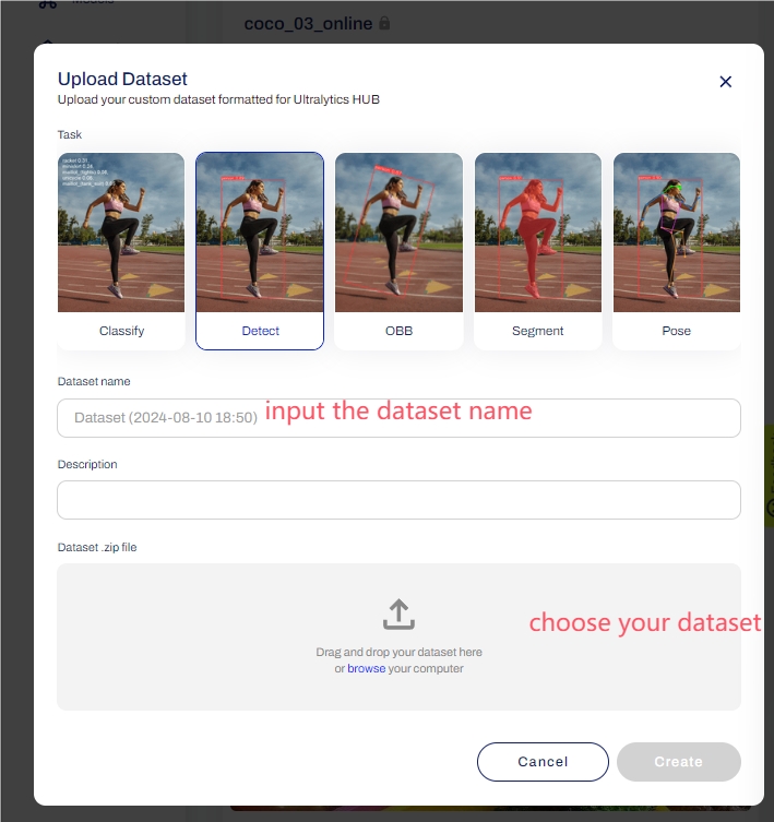 If you are training in the cloud, you must upload your dataset to the ultralytics hub. The upload process is very simple: