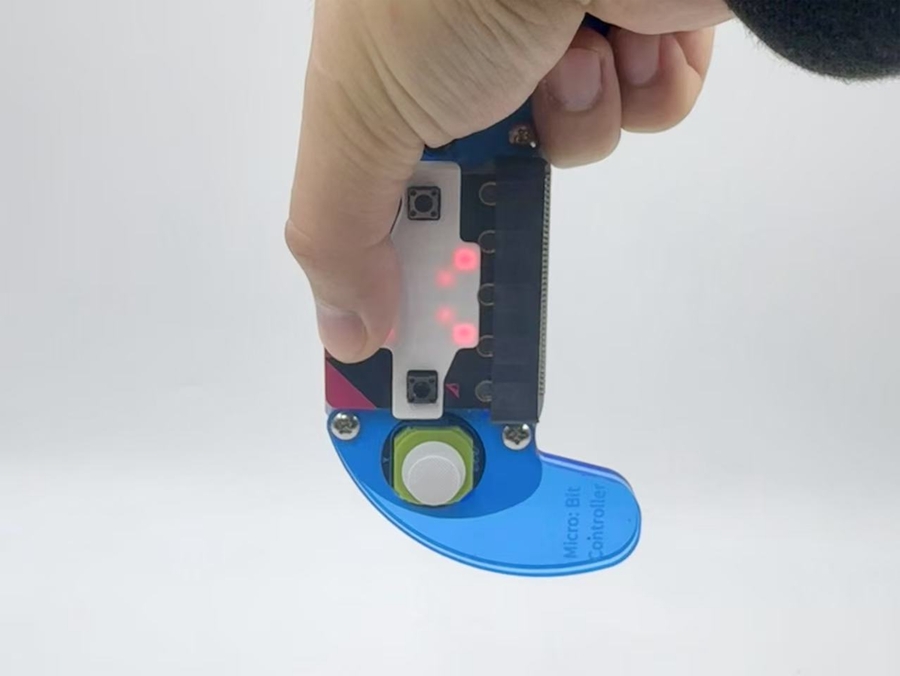 This remote controller is a Micro: Bit-based gamepad. It includes a 4-direction joystick and four undefined buttons. To enhance the gaming experience, it is also paired with a buzzer and vibration motor. It is compact in appearance, comfortable in hand, and can be remotely controlled.