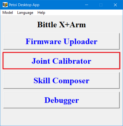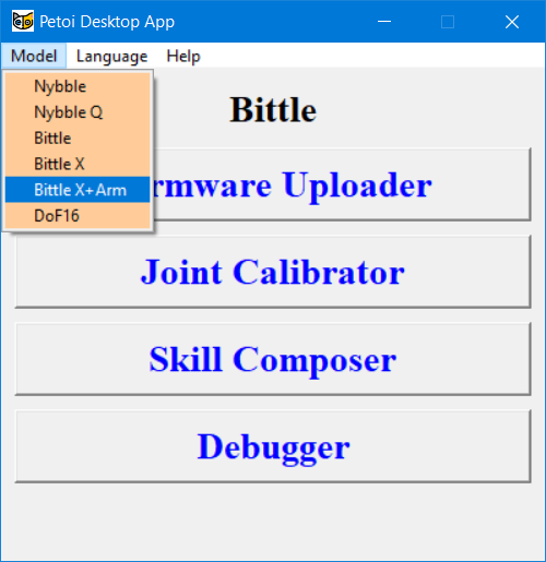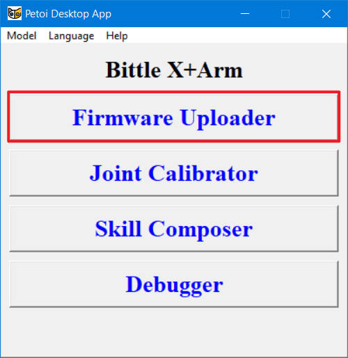 In the Petoi Desktop App, choose the model Bittle X+Arm, then click the Firmware Uploader button to upload the firmware for the robot with an arm.