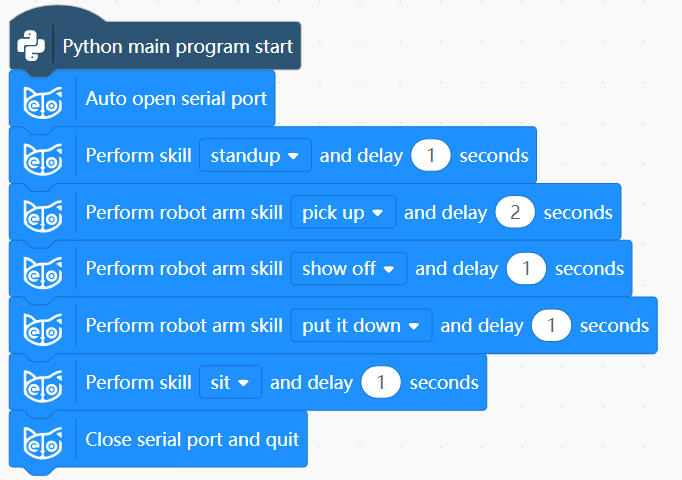 You can use the Perform robot arm skill block in the Petoi Coding Blocks to do some pre-defined skills.