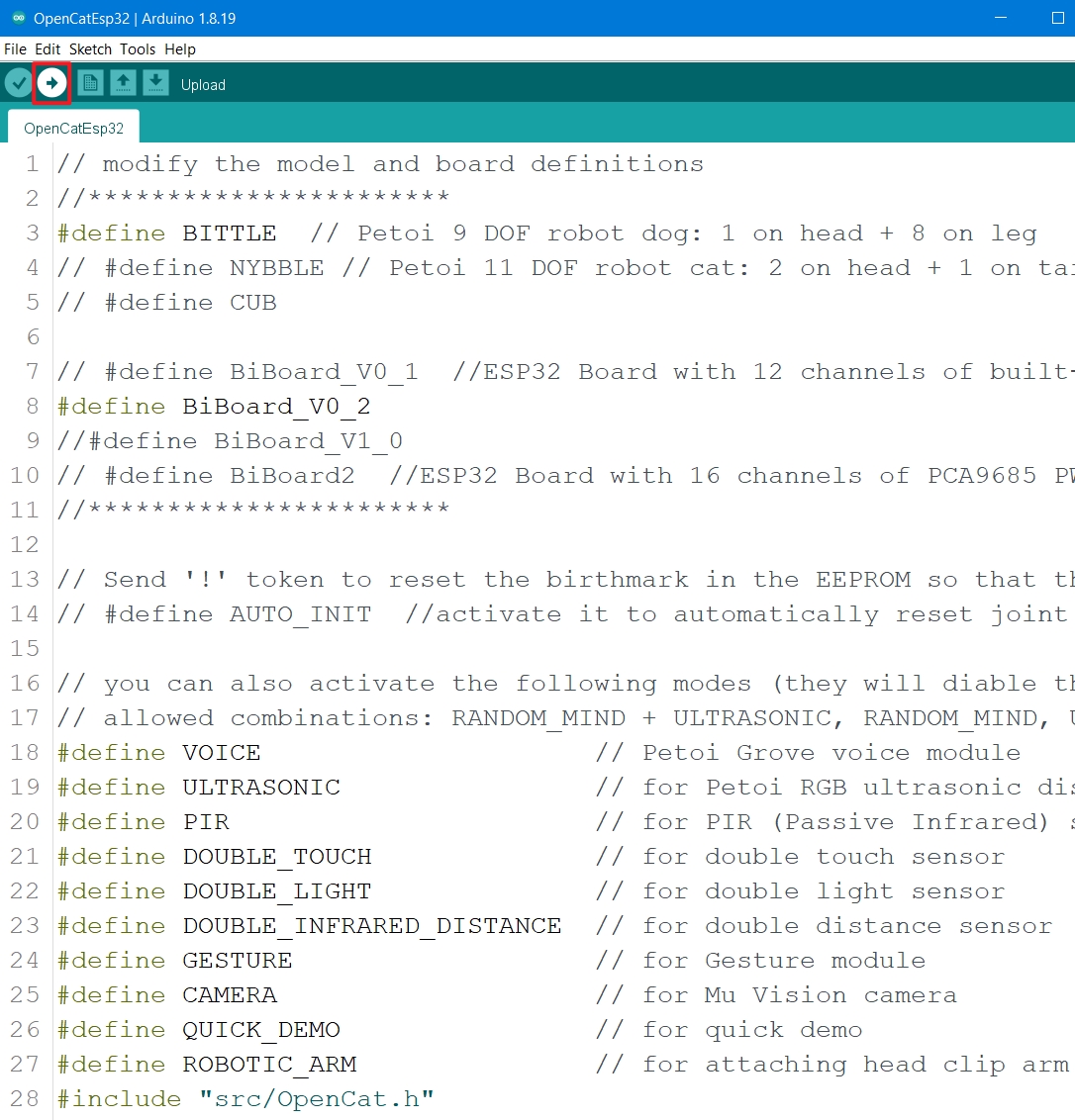 After the modification is completed, you can click the Upload button (as below) to upload the sketch OpenCatEsp32.ino, and the changes in the code file will be automatically saved.