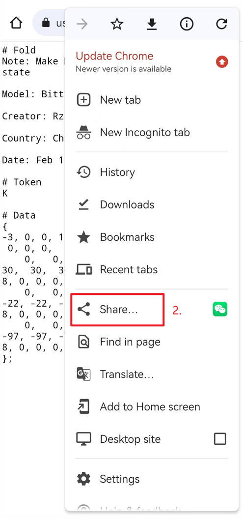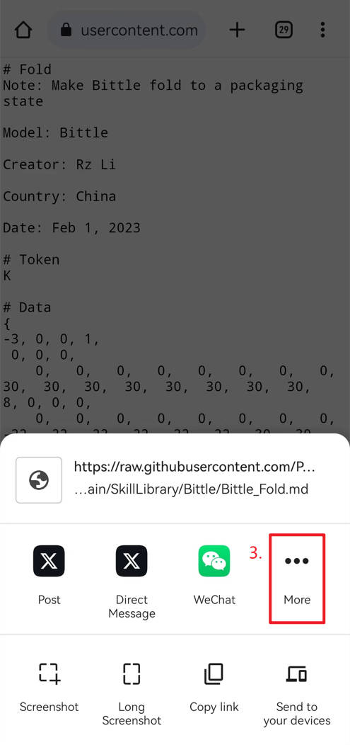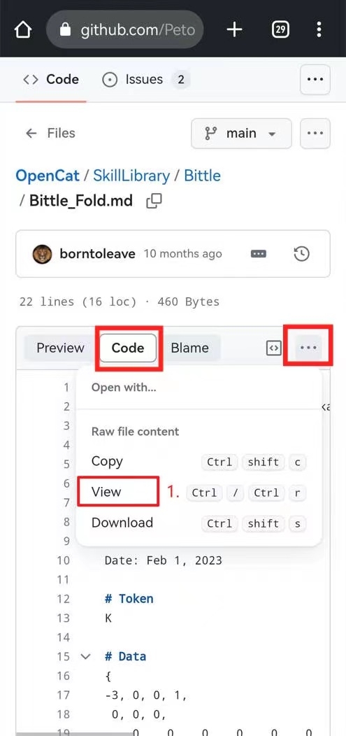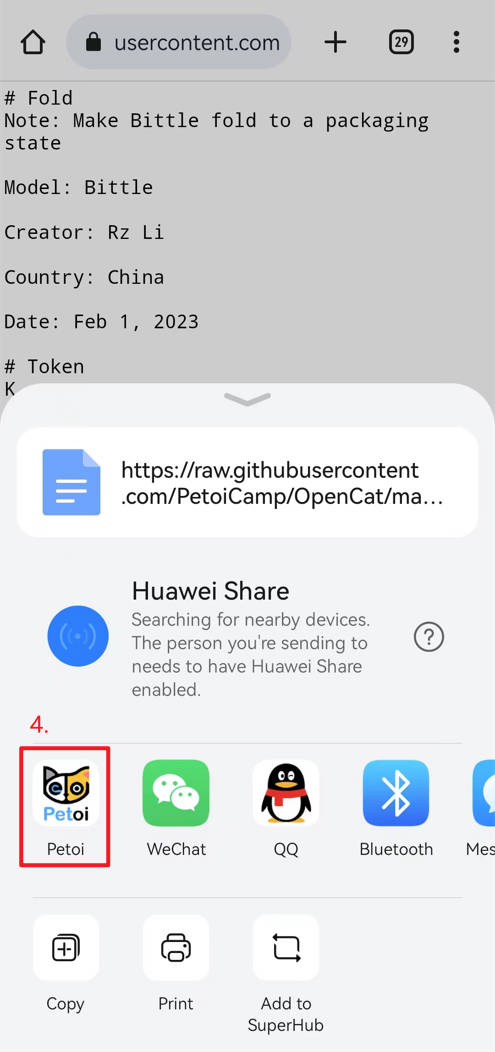 The SkillLibrary folder in Github contains new skills for the OpenCat robot, which can be used for your reference. You can use your mobile browser to access the GitHub page of the OpenCat project, open the skill file (such as Bittle_Fold.md), select the "Code" tab, and share it with Petoi Mobile App(make sure the mobile app is connected to your Petoi robot first), as shown in the figures below. Then you can execute this skill by pressing the newly created command button.