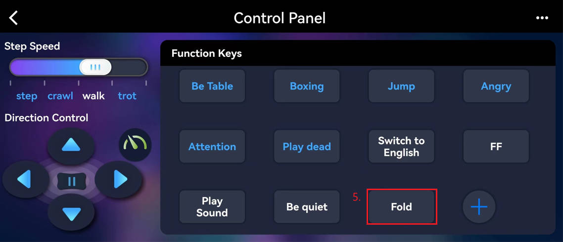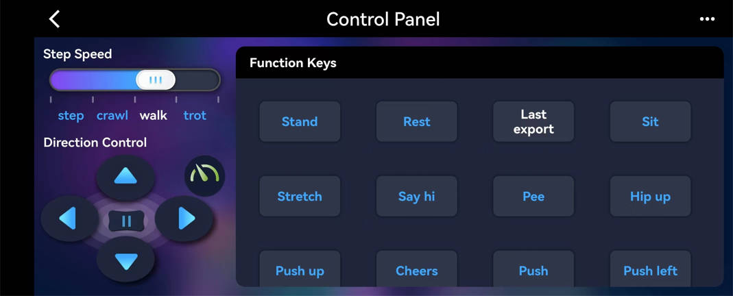 The left panel sets both the robot's gaits and directions and send combined command, such as "walk left" and "trot forward". The robot will only move if an initial gait and direction are selected. The "step" has no direction, and "backward" has left and right directions. The pause button "||" will pause the robot's motion and turn off the servos, so that you can rotate the joints to any angle. The "Turbo" button (