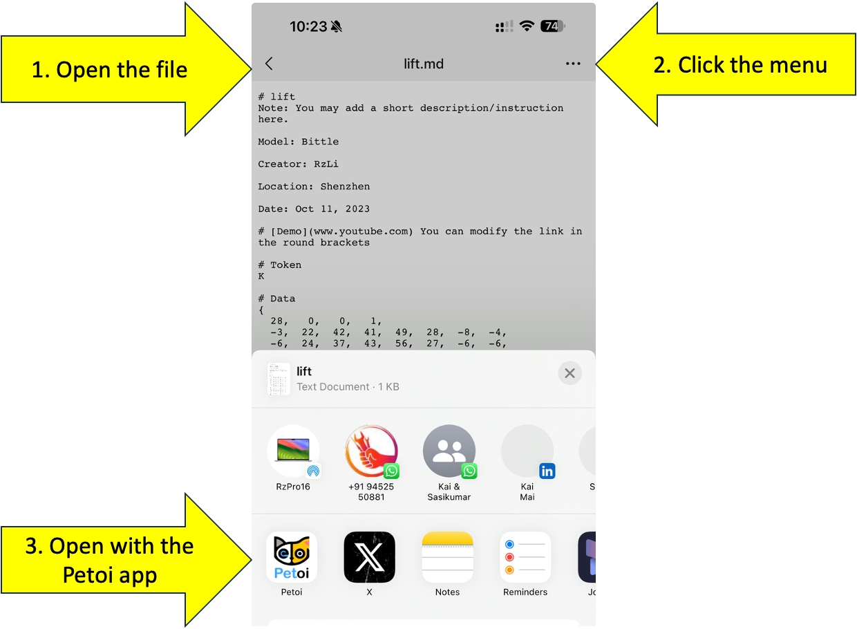 You can send the skill file to your phone using Messenger or email and open the file on the phone using the Petoi App. A button will be created for the new skill; you can see it when you open the control panel.