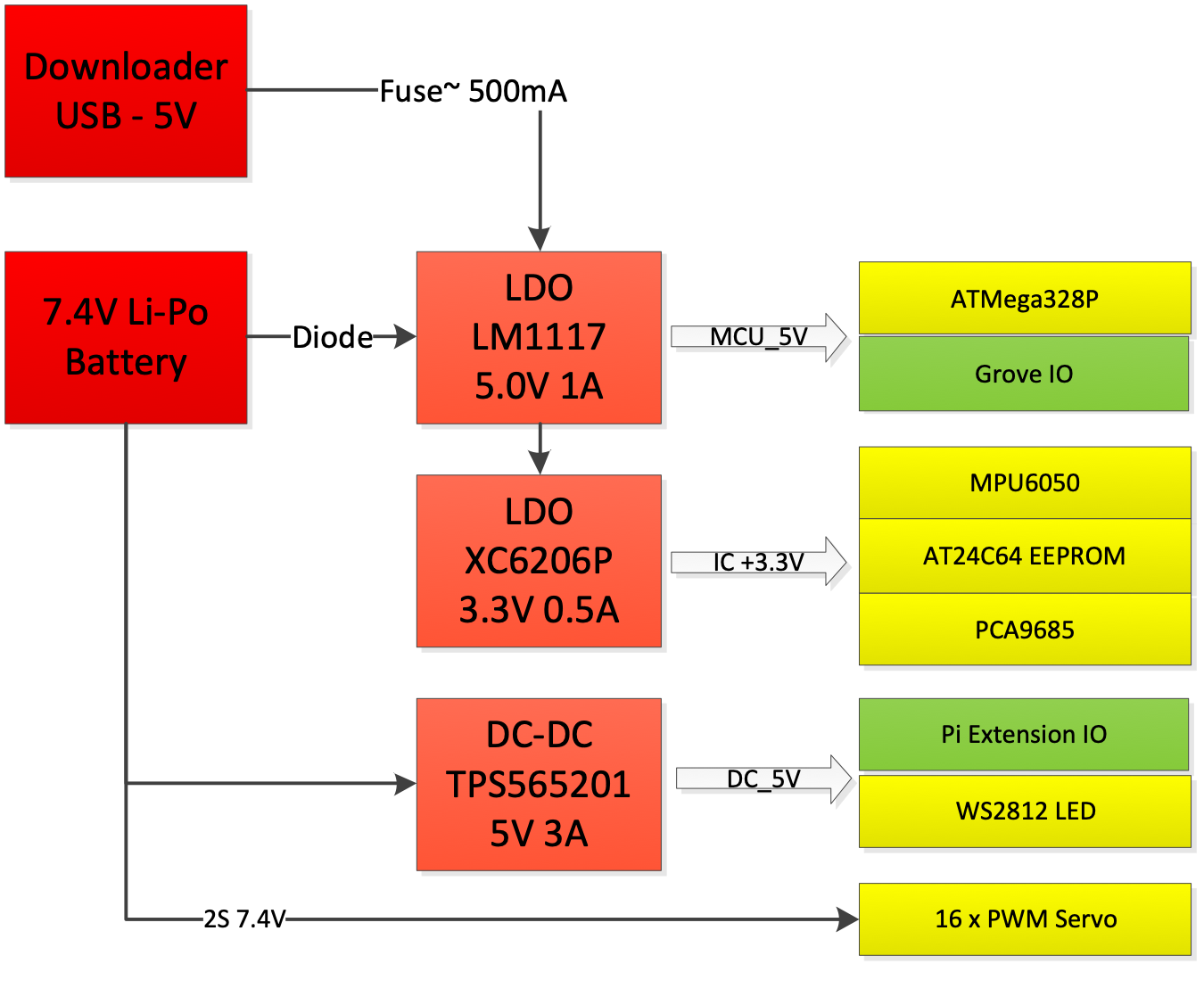 The main chips are powered by a Low-dropout (LDO) linear regulators for noise removal and better stability. We use LM1117-5V and XC6206P-3.3V to power 5V and 3.3V chips. The 3.3V LDO is connected in serial after the 5V LDO for better efficiency.