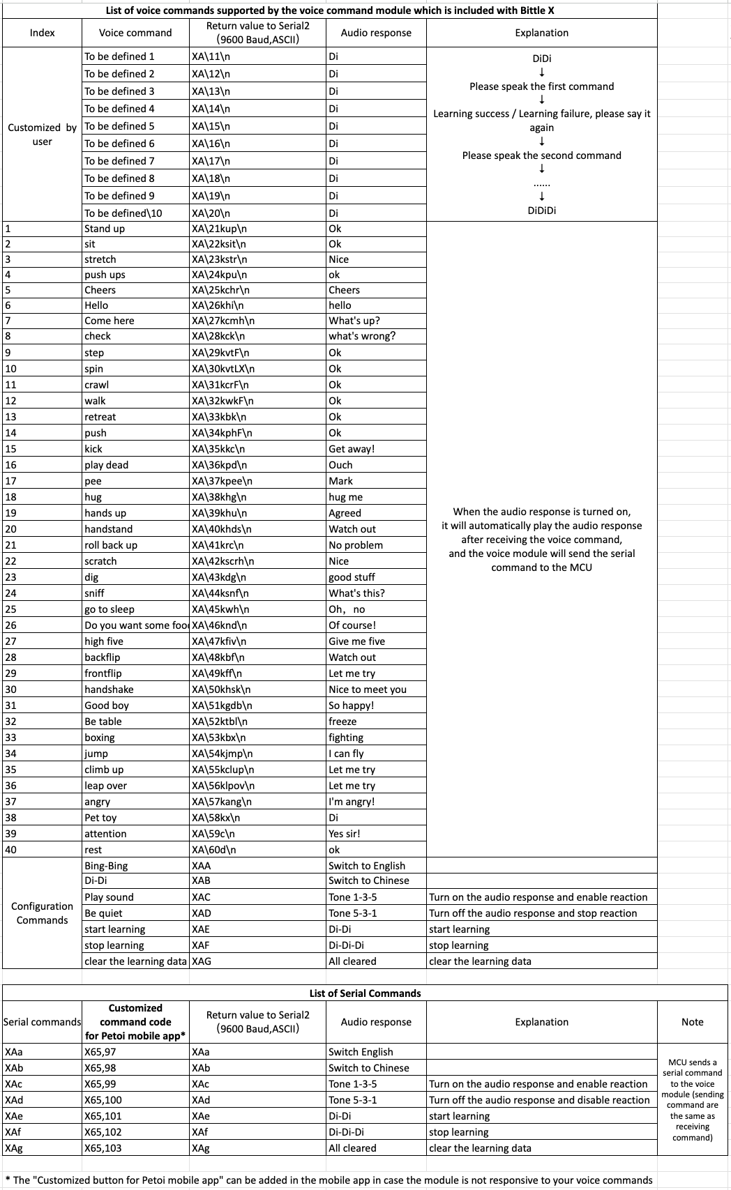 The voice command list for Bittle / Bittle X / Bittle X+Arm