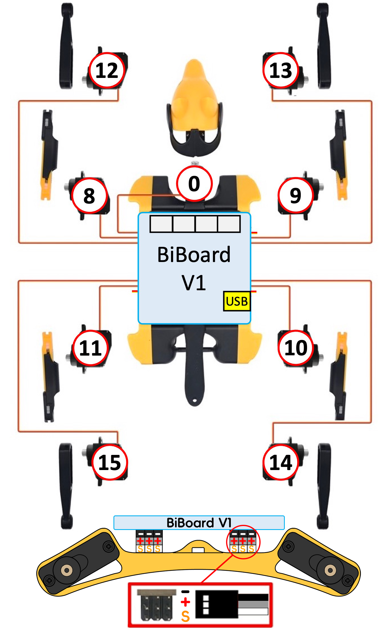 For the construction kit, please install the servo-related components as shown in the picture (calibration mode) and ensure they are perpendicular to each other (the upper leg is perpendicular to the torso, and the lower leg is perpendicular to the upper leg).