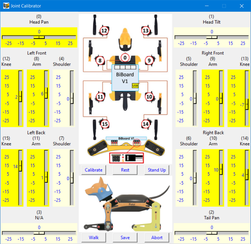 The joint calibration interface for Bittle X V2(BiBoard V1) in the Petoi Desktop App is as follows: