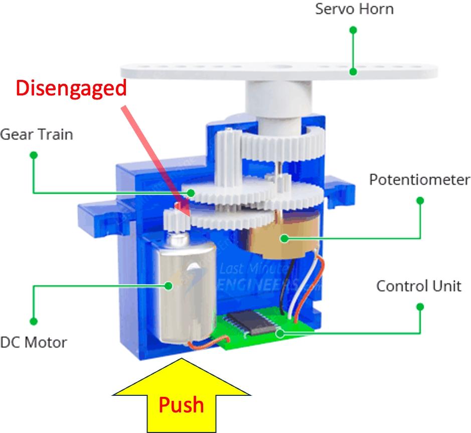 In some cases, the motor's output gear may disengage with the following gear. It will result in an abnormal buzzing sound inside the servo. You can take off the bottom of the servo and push the motor inward very hard until you hear a clicking sound.